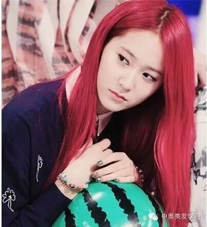 郑秀晶这款红色染发发型可够抢镜的,同时还显露出十足的时尚与潮流感,加上中分设计+两边自然散落的长直发,瞬间就带出了Krystal一张好看的鹅蛋脸。