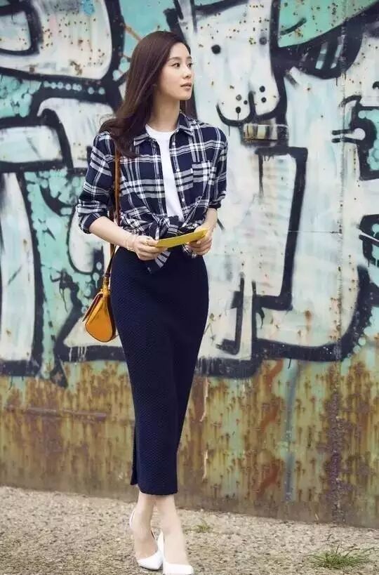 白T恤外搭格纹衬衫,随意打结,下身搭配深蓝色一步长裙,脚踩白色尖头鞋,清新优雅。