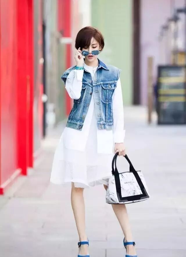 白色衬衫与蓬蓬裙叠穿营造层次感,外搭牛仔背心,脚踩蓝色高跟鞋,甜美可人不失个性。