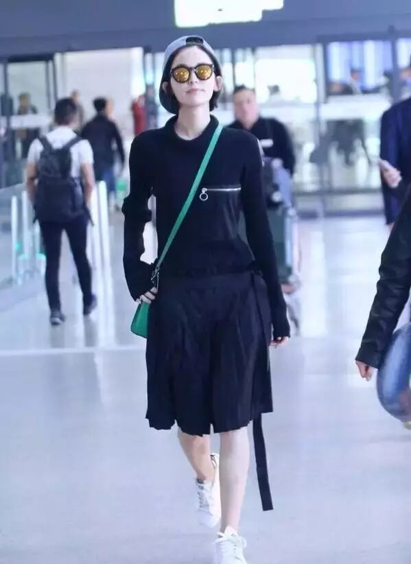 古力娜扎现身机场,小妮子穿黑色长袖针织衫配半身裙,背思琳绿色包包做点缀,脚上穿的是她最近蛮爱穿的阿迪达斯