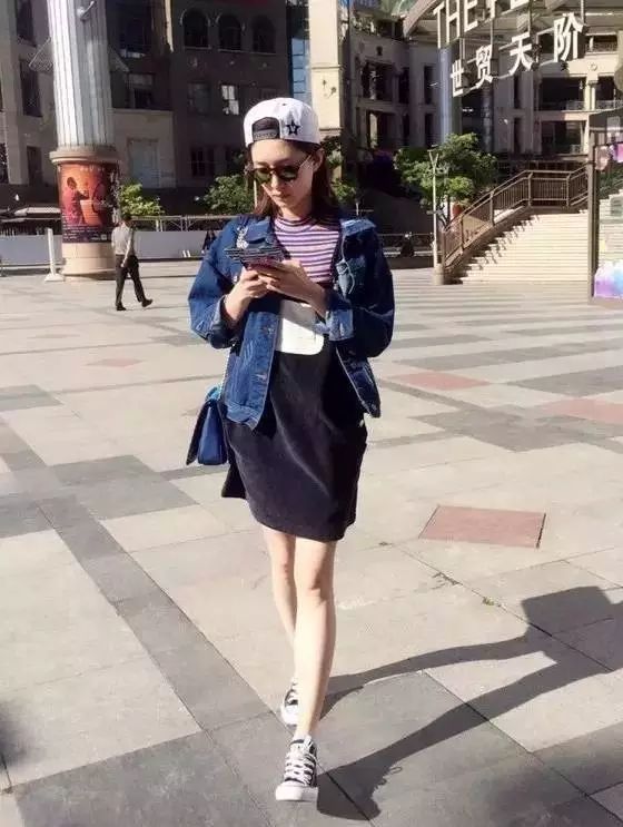 江疏影出街,条纹上衣搭配背带裙,外搭牛仔夹克,少女气息十足。