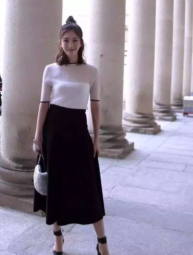 白色针织短袖上衣搭配黑色长裙,脚踩黑色绑带凉鞋,头顶半半丸子头,清新又迷人。