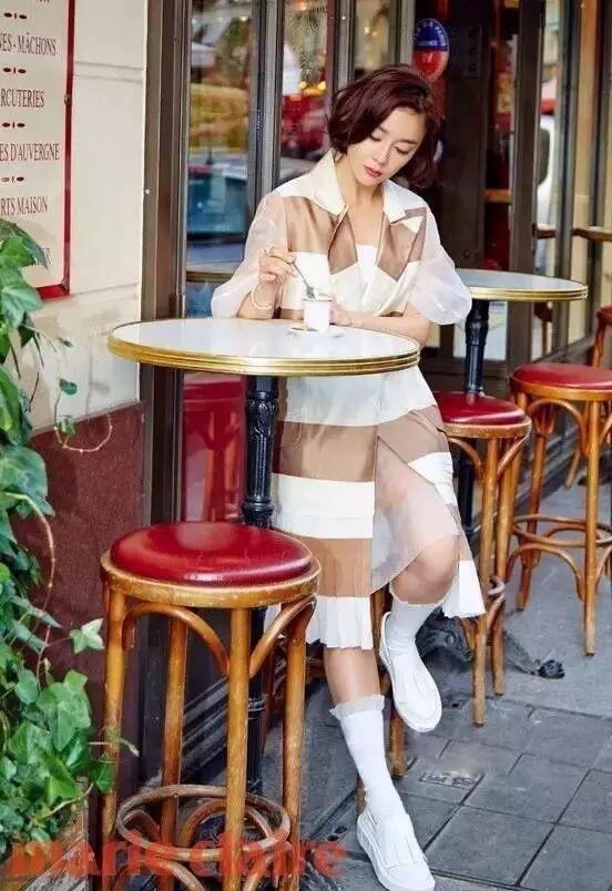 条纹背心外套与透视连衣裙叠穿,小撮小白鞋加白色长筒袜,倚桌而坐,优雅的品味属于自己的时尚慢生活。