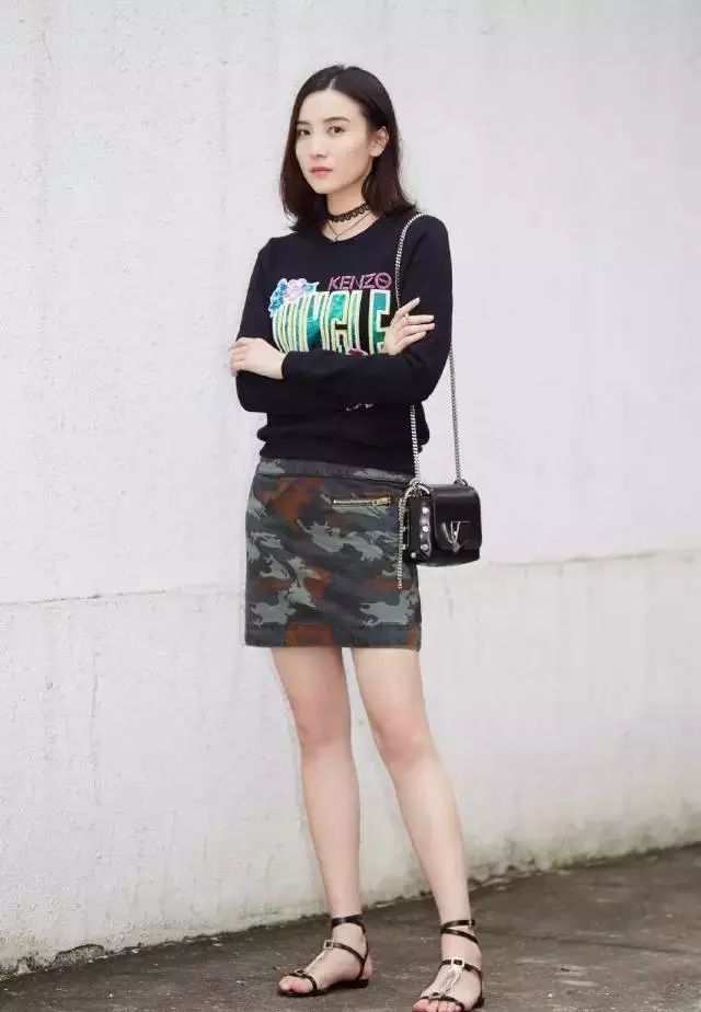 小花老师这身夏日穿搭还不错呢,卫衣配迷彩短裙有趣时髦,链条小包也蛮适合现在背,绑带凉鞋也好好看就是蛮挑战腿型滴!