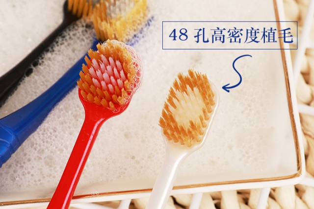 不仅如此,惠百施的宽头牙刷,还将植毛量增加到48孔,如此高密度的刷毛与牙齿的接触面积一下子扩大了一倍。