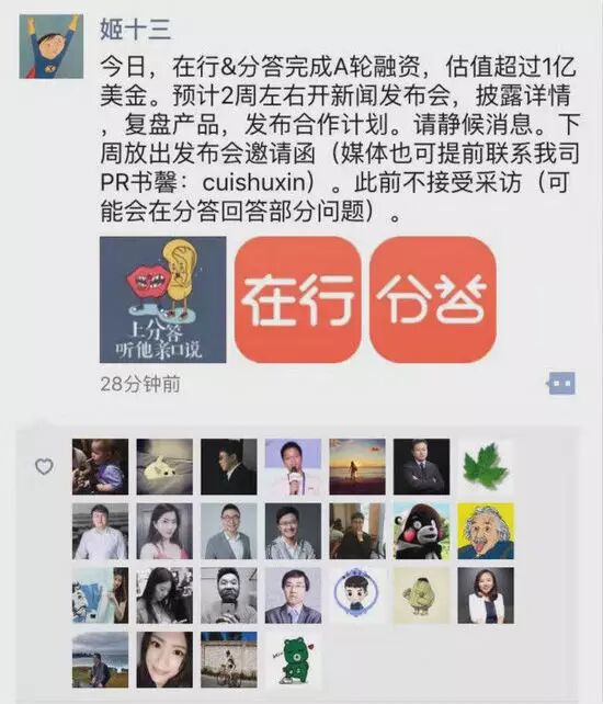 6月8日下午,姬十三(果壳网创始人兼CEO嵇晓华),通过微信朋友圈宣布果壳旗下“在行”、“分答”两款产品完成A轮融资,估值超过1亿美金。