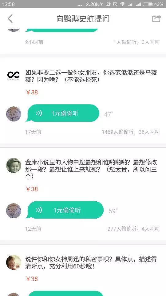 9、史航回答1387个问题,收益6万余元,几乎是把“分答”当主战场了。但相应的,提问回本风险很大,38元的门槛,偷听数从1人到500人不等,偶有“选女朋友的话,是会选马薇薇还是范湉湉”之类的爆款,但总体来讲,不推荐抱着赚钱目的问史航老师问题。