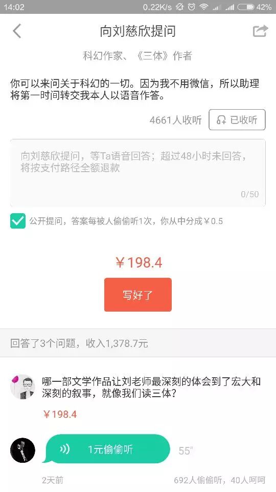 6、刘慈欣回答的问题是5个,门槛198.4元——看来他还是喜爱乔治·奥威尔甚于道格拉斯·亚当斯,偷听大概数百人,提问者都有得赚,但赚得也不算多,刘慈欣比较低调,问题也是助理转的。一些关于科幻创作的问题问完,可能就得等出个大新闻再问“大刘你怎么看”了。提问钱景不是很稳定,有可能渐渐淡出。