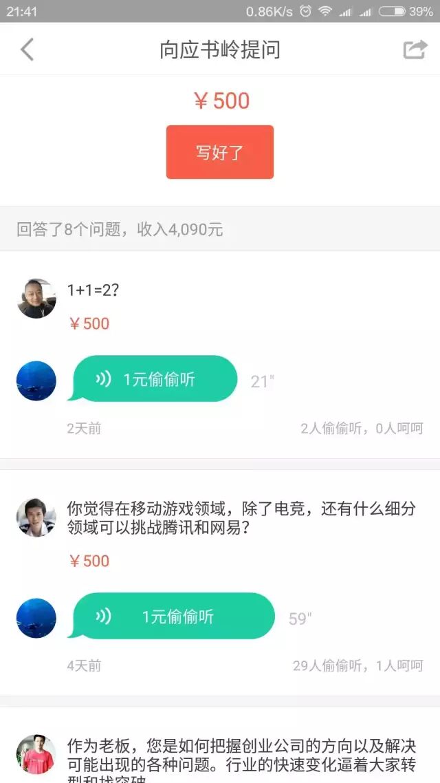 4、冯仑、应书岭(当然也包括王思聪)这种投资人、商界头头,只要有创业者存在,就不缺捧哏的——更何况我们游戏行业的精英,买个量刷个榜什么的,那是玩得极溜的,小小的“分答”运营团队,犹如刀俎间的鱼肉,根本无从招架,所以这一块流量的上限完全取决于精英对“分答”营销价值的理解。