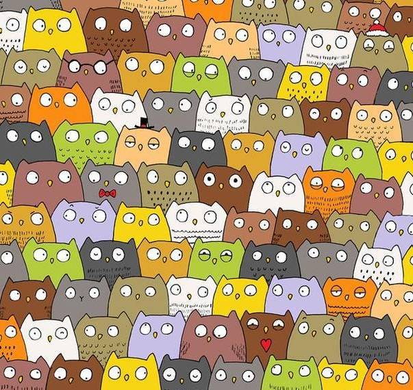 找出混在猫头鹰中的猫,据说在facebook上这图被转了118000次,要是那么轻易就能被你找到,这个还能活吗?你能找的到吗?(从下往上数)