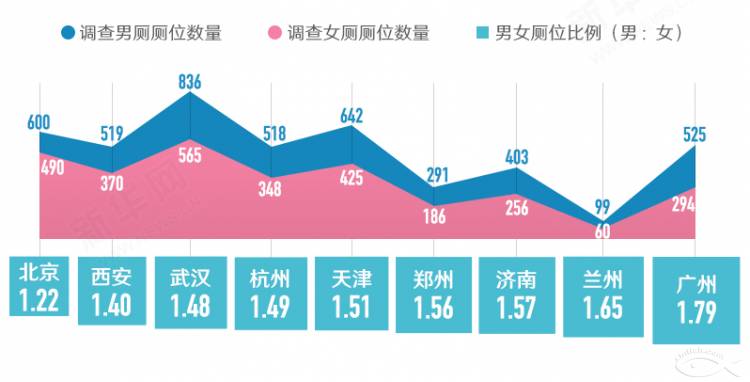 2013年,性别平等工作组发布的《全国九城市公共厕所男女厕位状况调查报告》调查了北京、西安、武汉、杭州、天津、郑州、济南、兰州和广州九个城市的男女厕所状况,发现每个城市的男厕侧位数量都大于女厕。
