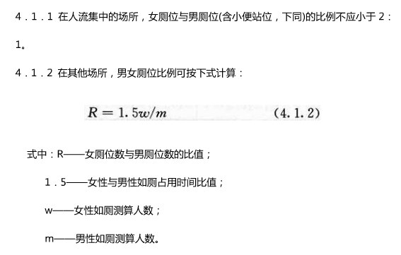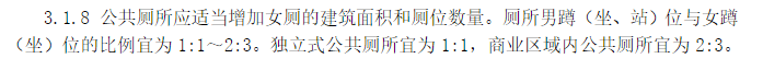 2016年,住房城乡建设部发布了2016年版的《城市公共厕所设计标准》,标准里强制规定女厕厕位和男厕厕位(包括小便池)的比例要按照公式计算,符合一定的标准,而且在人流大的地方,女厕和男厕的侧位得是2:1。