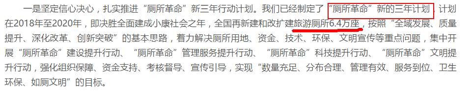 emmm,在2015年的时候,国家旅游局就制定过一次厕所革命三年计划,并给各地支持了10.4亿厕所专门资金、超过200亿的配套资金用于厕所建设,要在2017年新建改扩建旅游厕所5.7万座、实现“数量充足、干净无味、实用免费、管理有效”的目标。