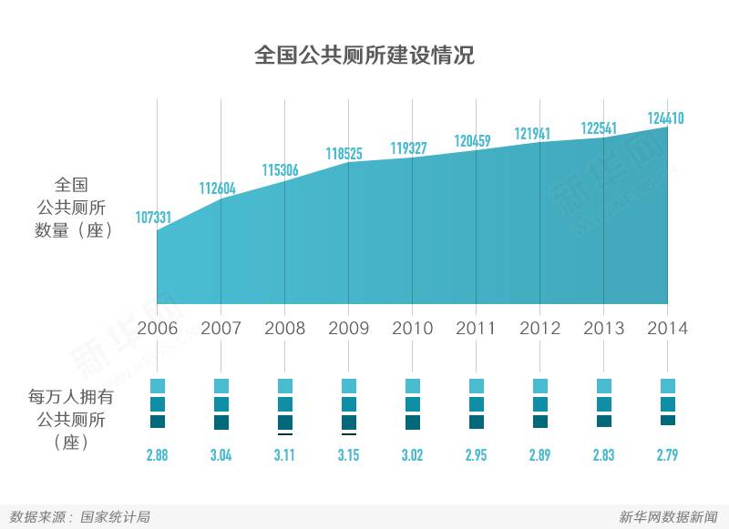 虽然公厕的数量越来越多,但我国公厕的人均占有率却在下降。从2006年到2014年,我国公共厕所的数量达到了12.4万座,人均占有率却从2.88万人共享一座一度变成了3.15万人共享一座。