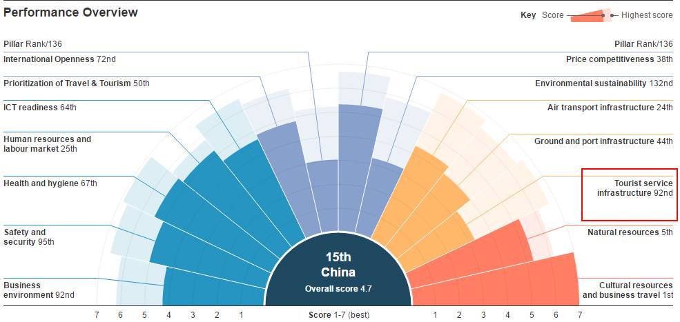 世界经济论坛在4月份发布了一份《2016-2017旅游业竞争力报告中》,参与排名的一共有136个国家,中国的旅游竞争力排到世界第15名。但在具体的衡量标准中,比如旅游的基础服务设施,中国位于92名,卫生条件中国位于67,都比较靠后。