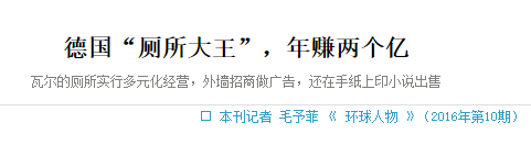 一个可以借鉴的成功例子是德国。德国的公厕直接交给市场负责,瓦尔公司就是靠着公厕挣钱的大家。