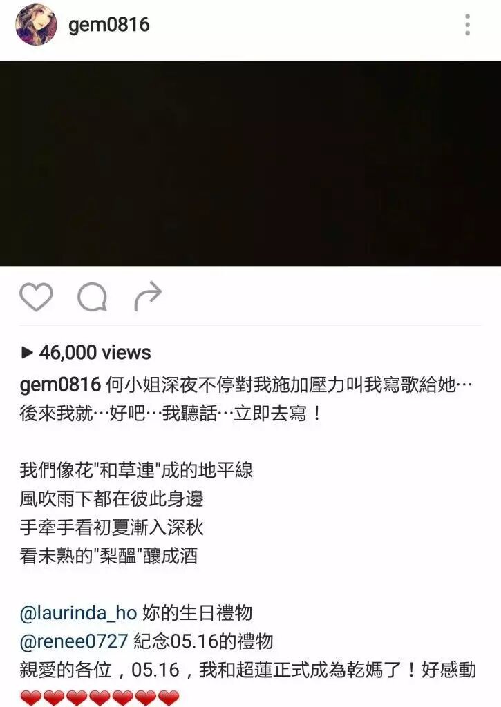邓紫棋(G.E.M.)昨日凌晨也在网上分享与李蕴和何超莲的合照,还亲自作曲献唱,祝贺李蕴当妈妈和祝何超莲生日快乐:「何小姐深夜不停对我施加压力叫我写歌给她⋯后来我就⋯好吧⋯我听话⋯立即去写!我们像花『和草连』成的地平线,风吹雨下都在彼此身边,手牵手看初夏渐入深秋,看未熟的『梨酝』酿成酒。何超莲妳的生日礼物、李蕴纪念05.16的礼物、亲爱的各位,05.16我和超莲正式成为干妈了!好感动!」