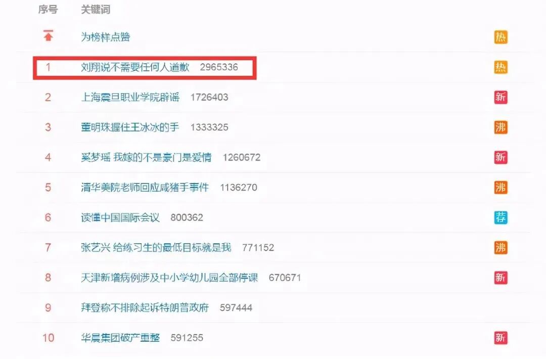 前段时间,刘翔在做客的一档节目中,正面回应了,“欠刘翔一个道歉”这一话题,于是在这个初冬的下午,话题#刘翔说不需要任何人道歉#,有些意外地一路在热搜上蹿红。
