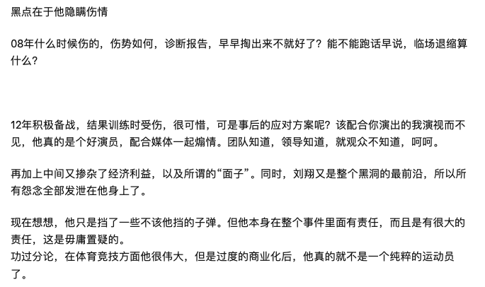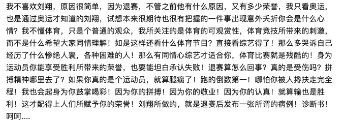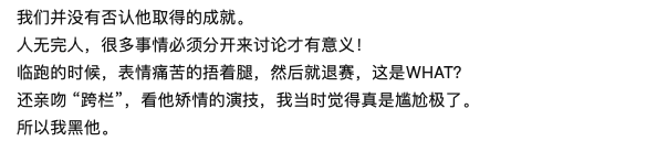 有人说:“这参赛名额是有限的 伤病未愈却坚持霸占一个名额。”