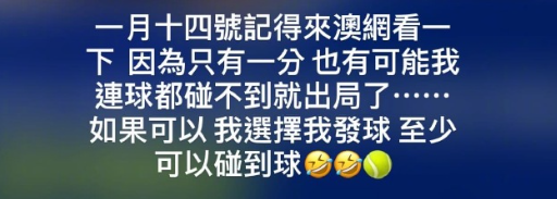 1月12日,周杰伦在社交媒体宣布将在1月14日晚上7:30以球员身份参加澳网一球制胜挑战赛(1 point slam):“如果最后胜利者是我,一百万美元,全部捐出。”