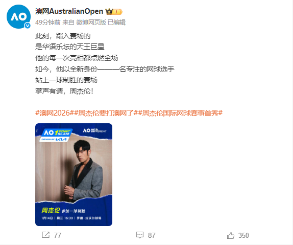 此外,澳网官方账号也发布称:从华语流行乐坛天王,演唱会座无虚席,到《青蜂侠》中的“加藤”,再到如今专注网球运动——欢迎周杰伦来到“一分网球赛”和澳大利亚网球公开赛。