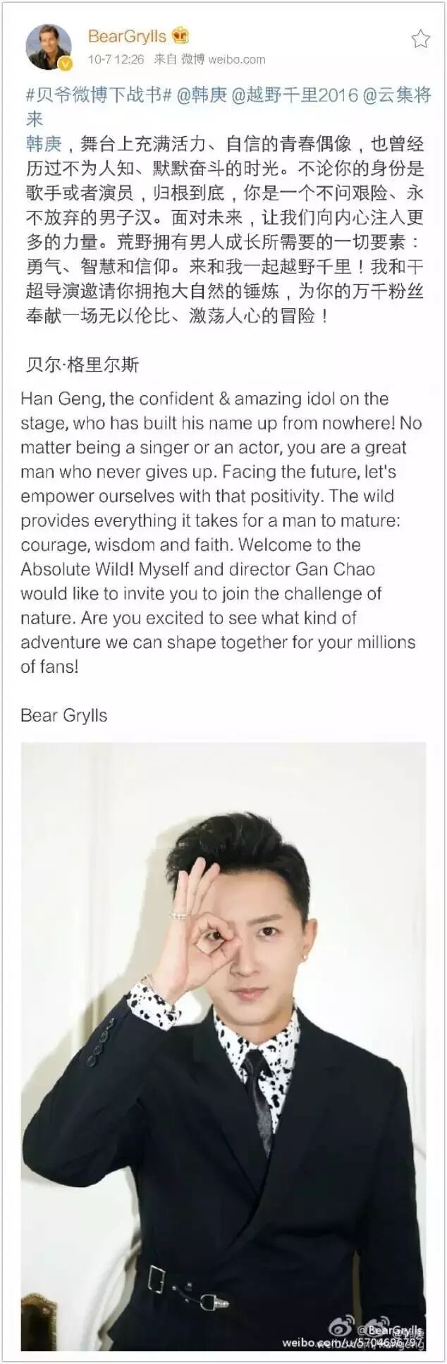 韩庚要和贝爷去越野千里了!