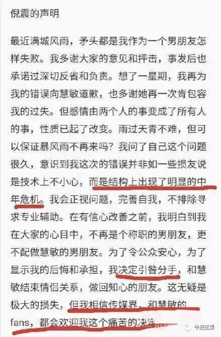 而倪老哥看到周慧敏动真格的了,立刻就嚎啕大哭,当着镜头的面公开忏悔,声称自己的错误是“中年危机”造成的。
