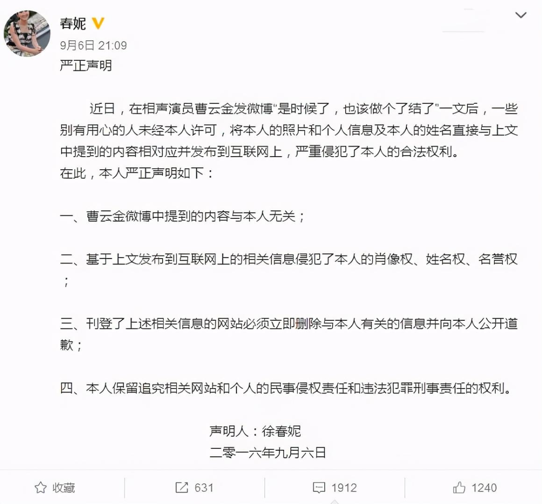 最后,还是春妮在社交平台发文澄清,谣言才暂时平息。