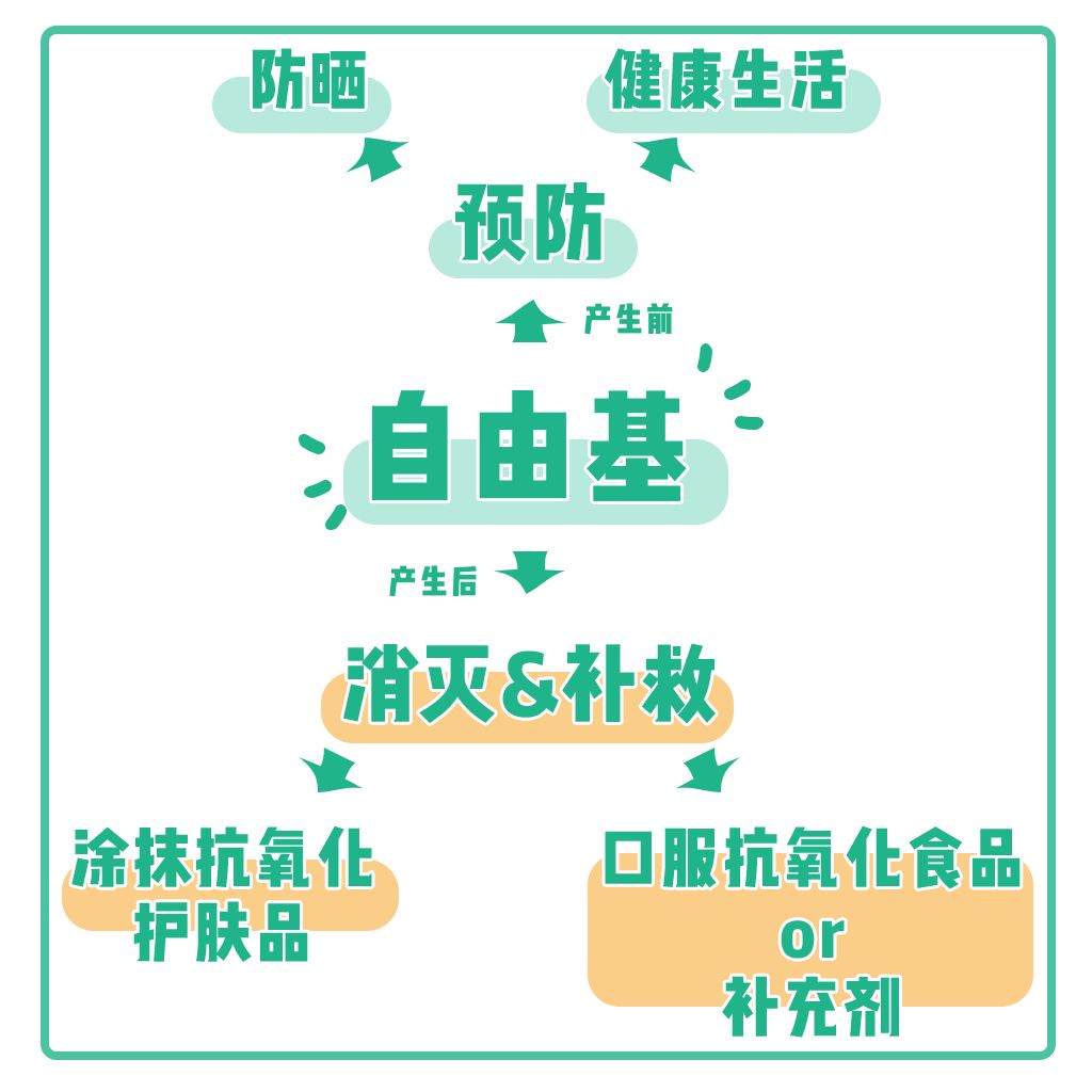 2.消灭已经产生的自由基+做补救工作(涂抗氧化护肤品+口服抗氧化产品)