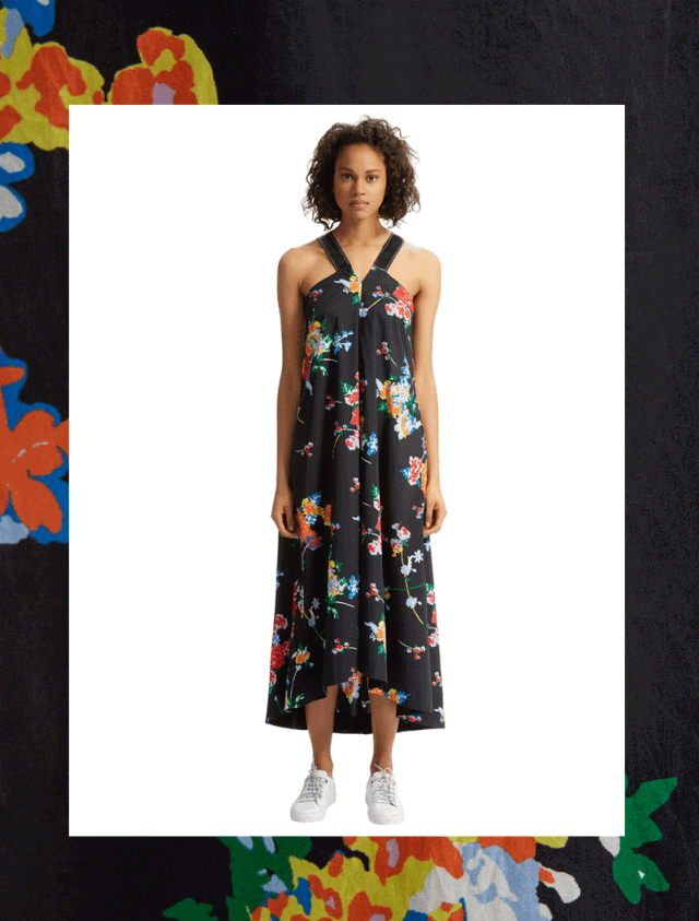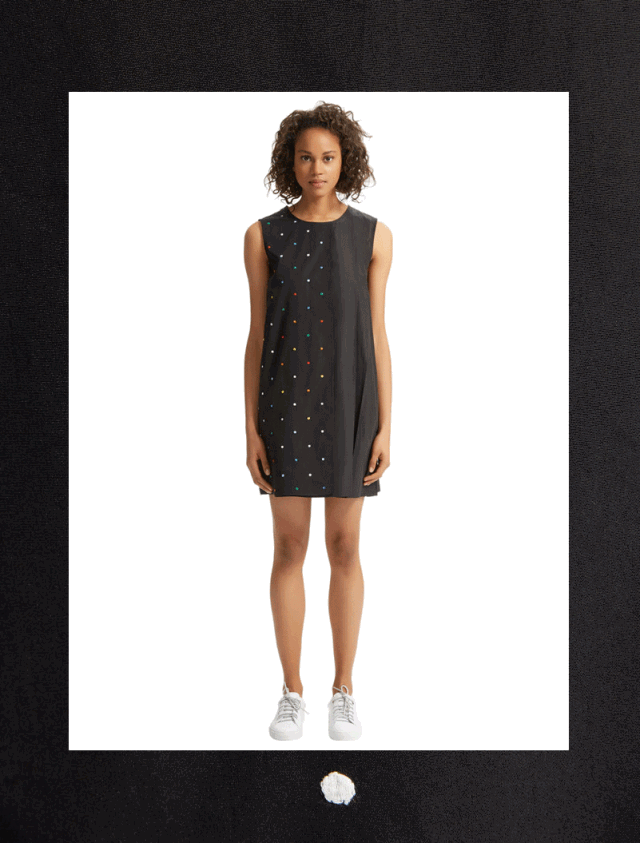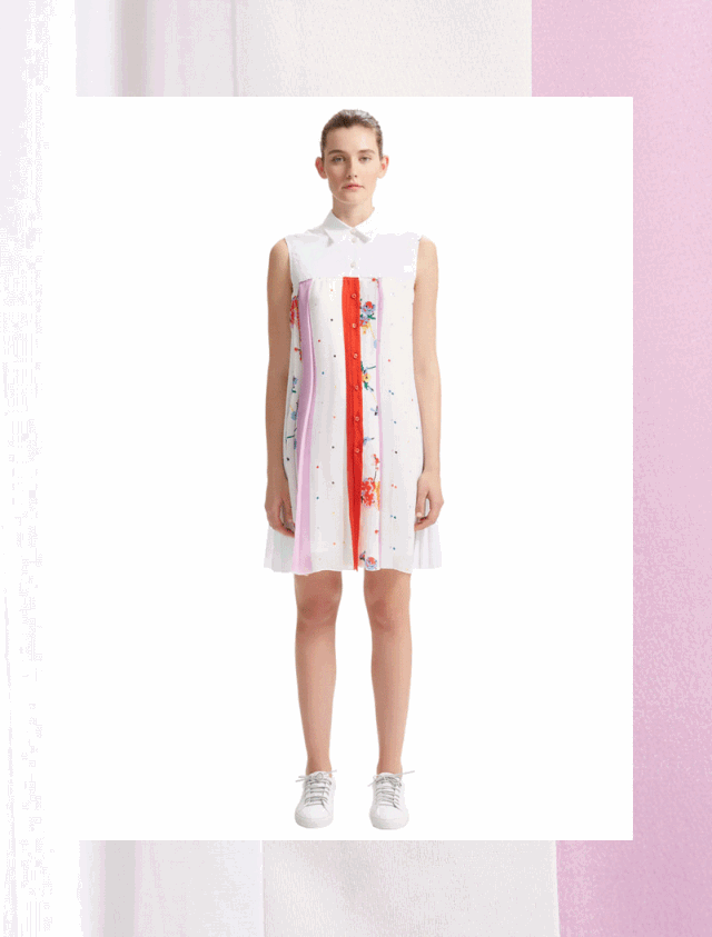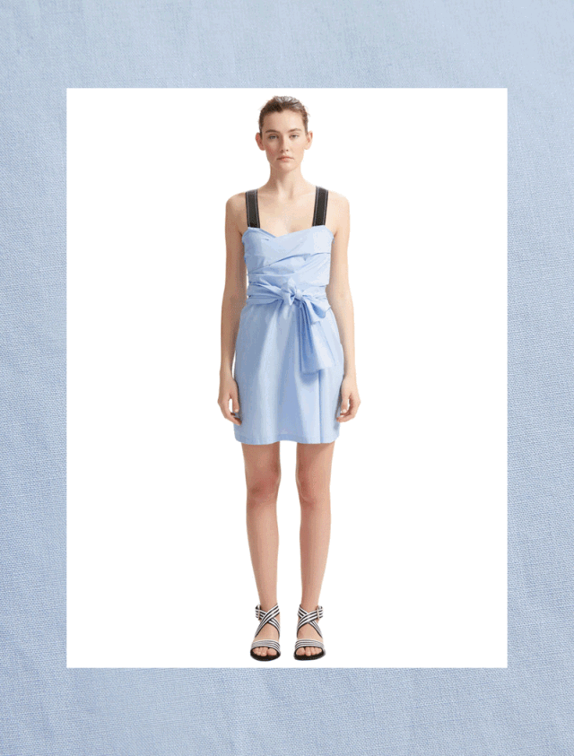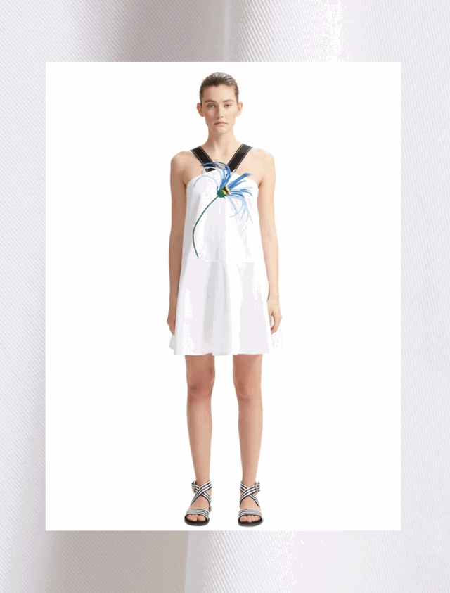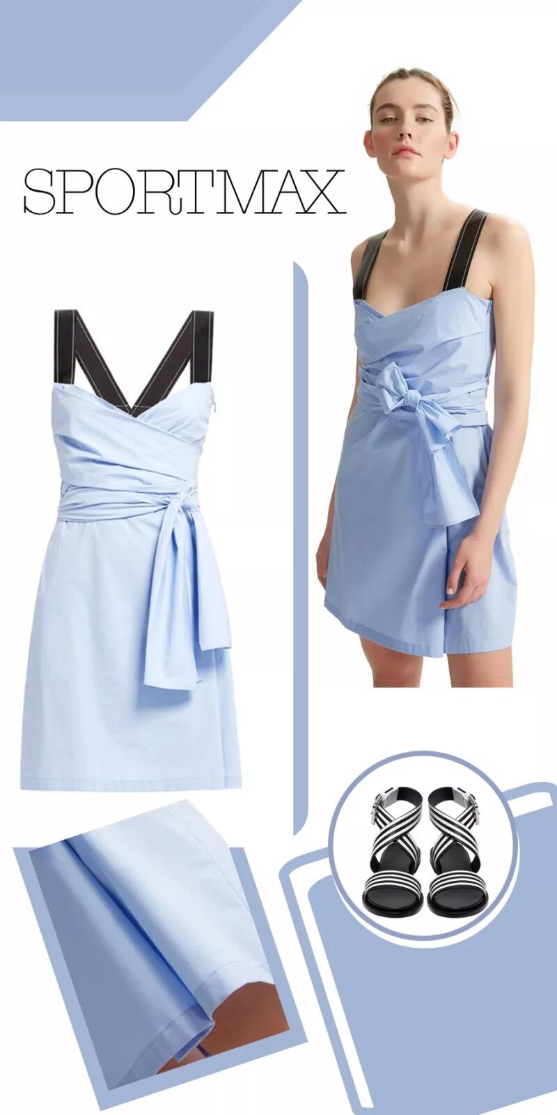 使用淡蓝色府绸面料剪裁而成的不规则吊带连衣裙,上半身采用褶皱紧身胸衣设计,极具方向感的对比色肩带彰显了穿着者不拘一格的气质。在腰部设计有别致的腰带,可打结或绑成弓型,个性鲜明。