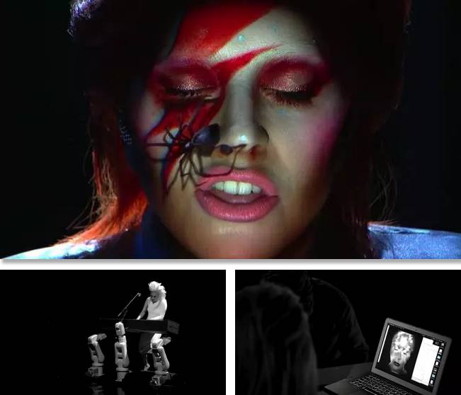 借助Intel的RealSense实感技术和脸部3D投影技术,Lady Gaga的脸上的妆容真是秒秒瞬变,大卫·鲍伊的不同经典造型在LadyGaga的脸上呈现。还出现了蜘蛛爬过她的脸颊,其逼真程度还真让人为Gaga担心。