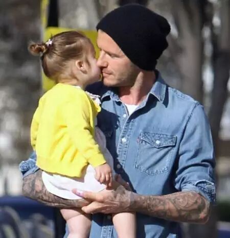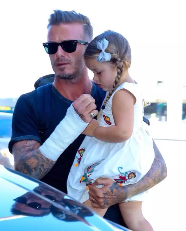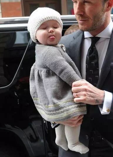 一出生就跟着到处看秀,而且是坐在小贝腿上。