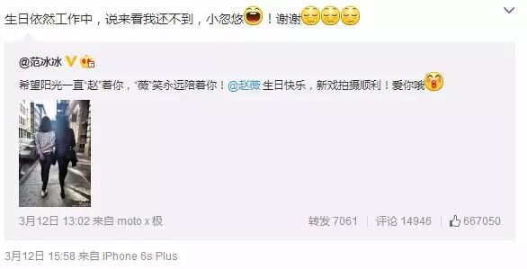 眼看着又将掀起一场腥风血雨的粉丝骂战,又恰巧逢上赵薇生日,林心如还赶在零点送上了祝福,所以无数眼神锁定了范冰冰。其实看范冰冰微博不难看出她并不是一个喜欢到处祝人家生日快乐的人惹, 但是这次的行为简直想给她情商满分。
