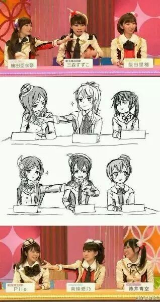 在去年的上海活动中,中文最好的里p想要对三森说,园田海未的海就是上海的海,结果貌似一时忘了怎么发音,指着三森连着说“上,上,上,,,,,”