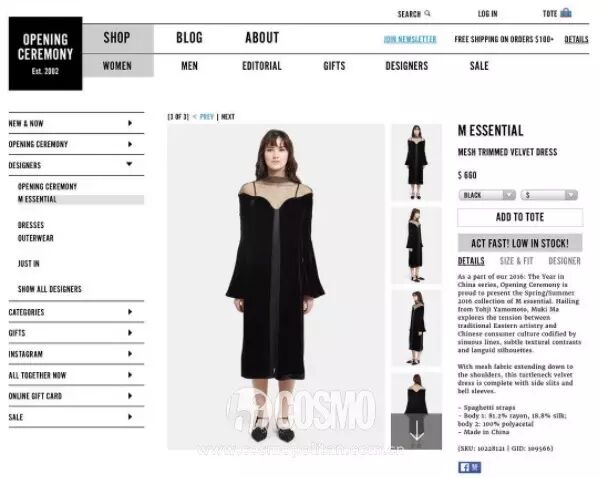 它家价格也不算便宜,连衣裙在2-3k,店铺在北京上海和天津都有。去年,M essential正式入驻美国潮牌店Opening Ceremeny 。