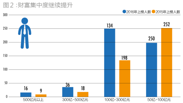 从财富量级看,超级富豪的人数也大量增加,百亿富豪比去年大幅增长87.6%,达到302位,超过上榜富人总数的60%(图2)。无论财富总额、平均财富、上榜门槛还是百亿级富人数,今年均创下了历史新高。
