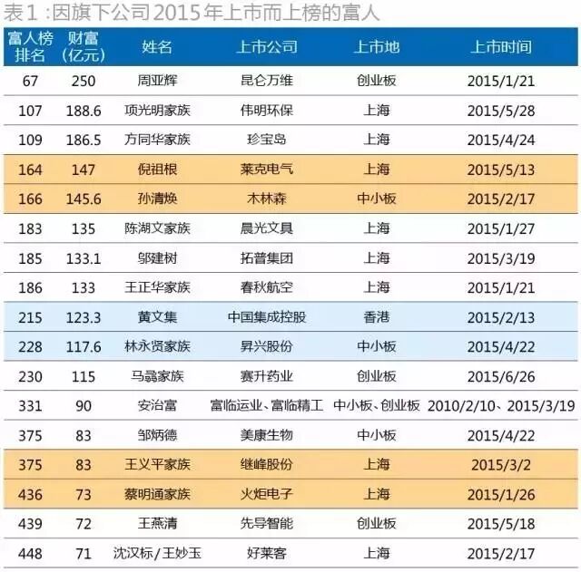 一些早前已经上榜的富人,也由于旗下公司2015年上市而身家倍增。例如,王均金家族因旗下吉祥航空、柯尊洪因旗下康弘药业在A股上市,财富增长分别达到483.3%、344.4%;保利协鑫的朱共山因旗下民用光伏产品板块借壳*ST超日,财富由去年的69亿元大增408.7%至350亿元;许世辉家族更因达利食品登陆港交所,一跃成为福建首富。甚至连今年首富王健林的财富构成中,也有约50%来自于新上市的万达院线的贡献——2015年1月IPO的万达院线,一年时间股价就暴涨了10倍,弥补了房地产市场下跌对王健林财富的冲击。
