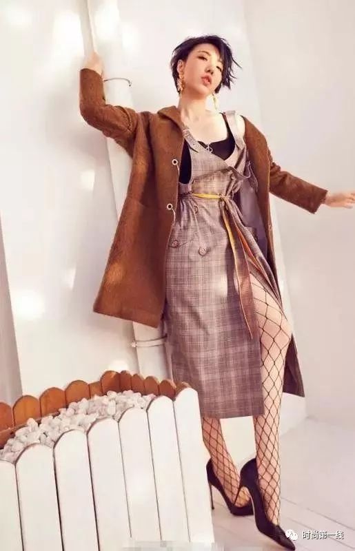 黑色的吊带+格子吊带裙+驼色的外套+黑色的渔网袜+黑色的高跟鞋,高开叉的裙子设计凸显出一双大美腿,时髦又不失性感女人味!
