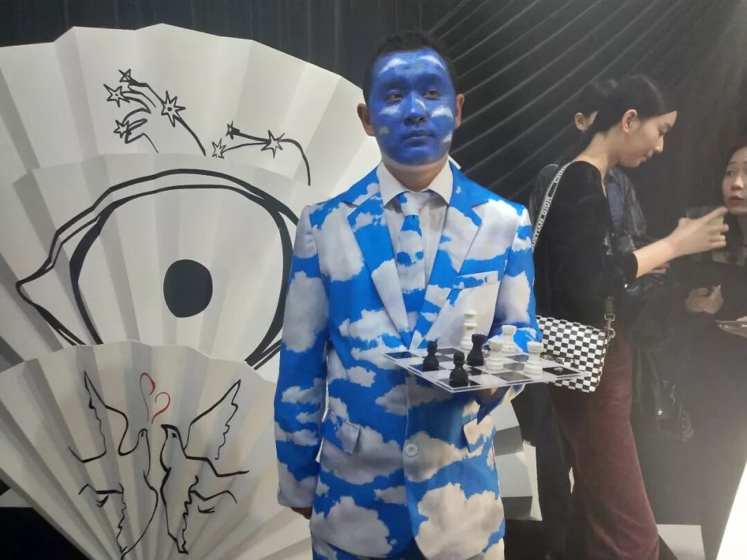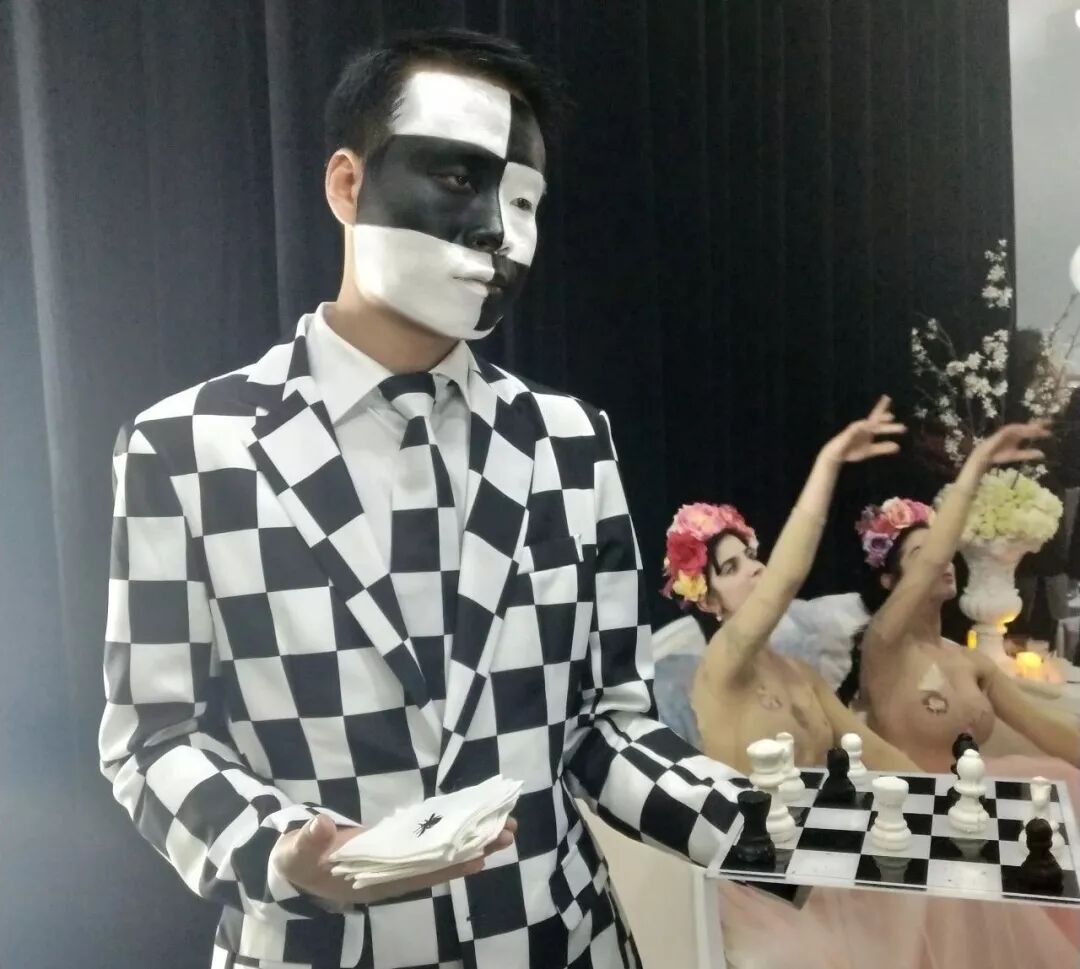 首先,光是舞会服务生的穿着就很有特色——黑白棋盘格套装 or 蓝天白云套装。