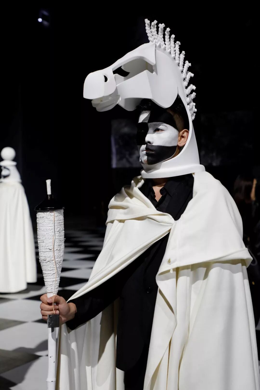 除了棋盘格元素之外,秀场屋顶上悬挂的巨大黑色鸟笼,各种白色的人体部位石膏雕塑,以及雕塑化的帷幔,同样也是构成超现实主义基调的重要组成部分。
