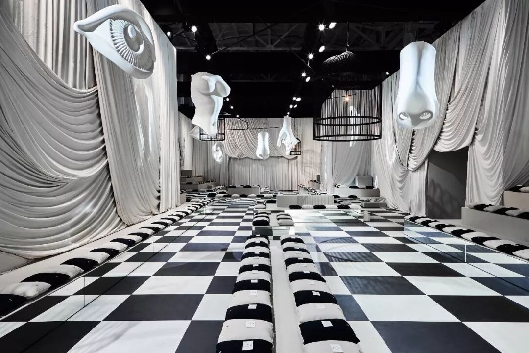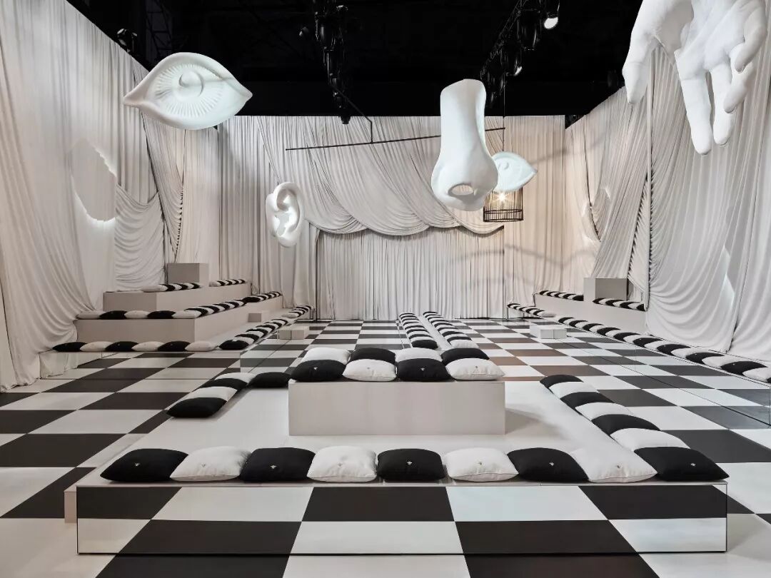 进入秀场,黑白格元素依旧充斥满眼,整个空间也因近大远小的视觉错觉得到了无限的延伸。