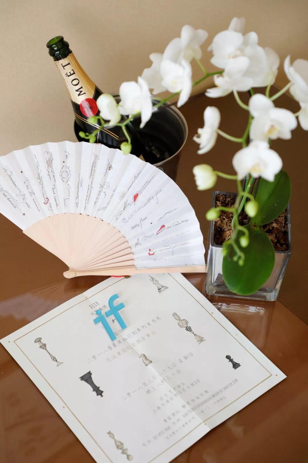 走进房间,桌子上整整齐齐地摆放着一盆兰花、一瓶香槟、一把折扇,以及邀请函。▼