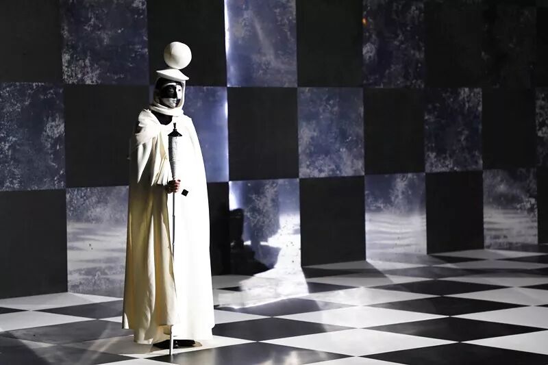 场馆的墙壁与周围的地面形成了一个三维立体的黑白棋盘空间,巨大的黑白棋子立于地面,可能是在摆着什么棋谱吧。