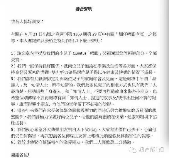第二,谢霆锋张柏芝联手发声明驳“Quintus不见谢霆锋”、“Lucas上教会学校"等传闻;