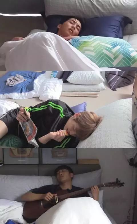 看大家缩在被子里玩手机游戏、看漫画书、弹吉他,完全的不加修饰、完全放松,令人感觉亮闪闪的韩流巨星和偶像在休假时也跟大家没什么不同, 反而很单纯随和,简直无限共鸣啊~