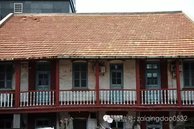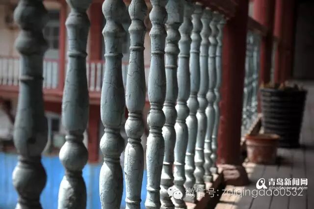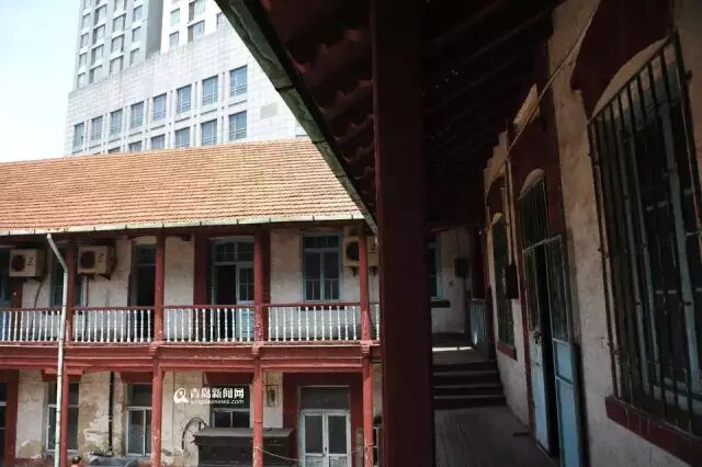 现在是青岛国风集团医药公司的办公所在地,通过一道老旧的铁门,穿过幽暗的走廊向右一转,就来到一片空阔的天井,楼房的楼梯和二楼的栏杆都是木质的,一根根红色的圆柱将建筑分成一个个房间,从外观上看,建筑物保存得较为完整。
