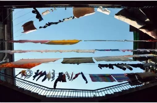 ✪ 很多晾衣绳横穿而过,从建筑的这一角连到那一角,五颜六色的衣服"结"满了整个里院的天空。往上看去,寻不见任何章程,很快就混为一潭。