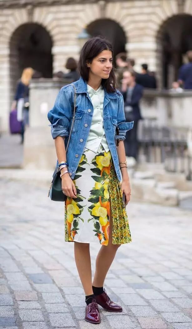 牛仔外套搭设计感十足的印花小黄裙,脚踩尖头牛津鞋,将袖口卷起来,很潮味。