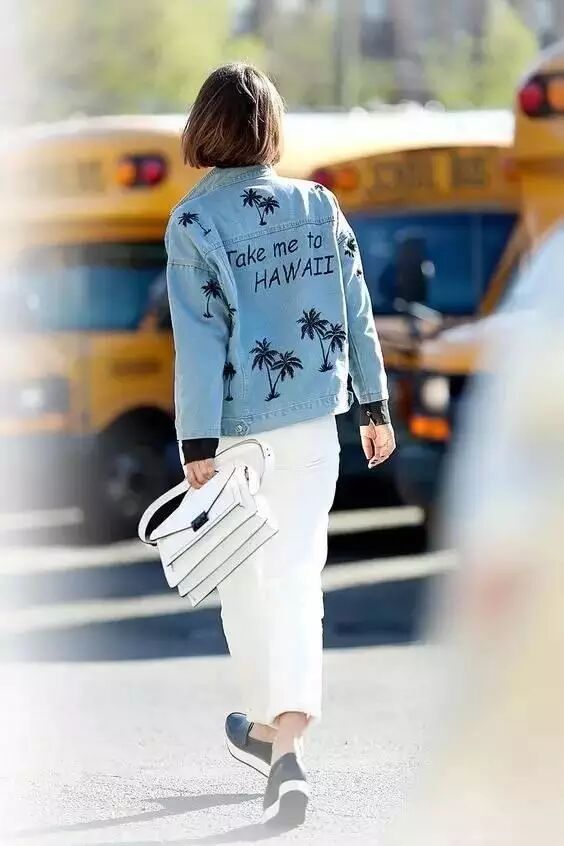 印花牛仔外套搭件白色阔腿裤,脚踩黑色休闲鞋,露出脚裸,时髦极了。