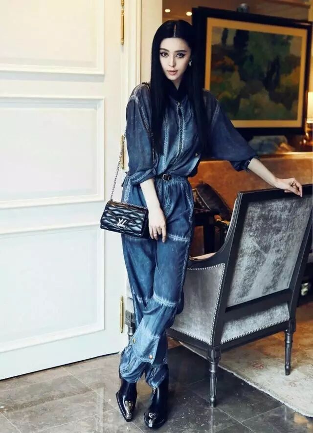 范冰冰穿牛仔连体裤,全身单宁元素搭黑色短靴,大气女王范十足。